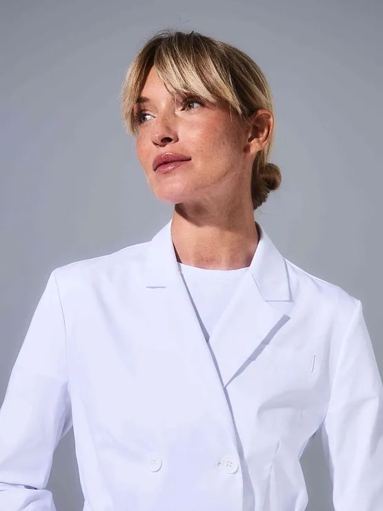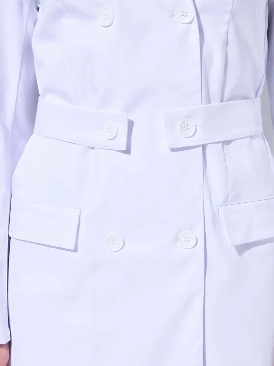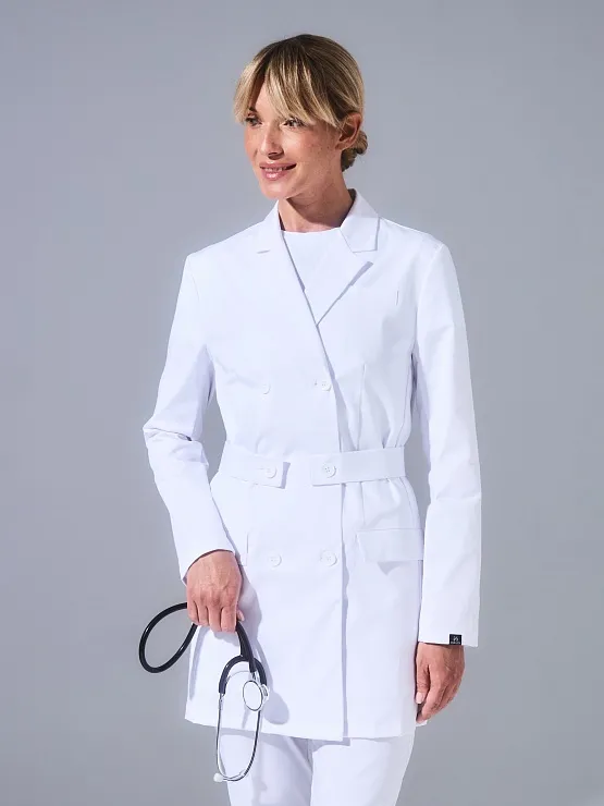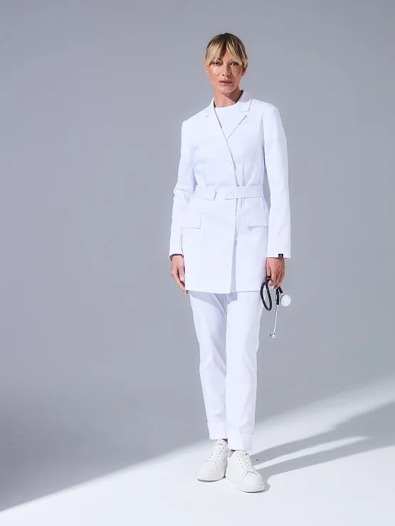 Медицинский двубортный жакет прямого силуэта со съемным поясом. Имеет два вместительных кармана.