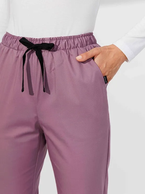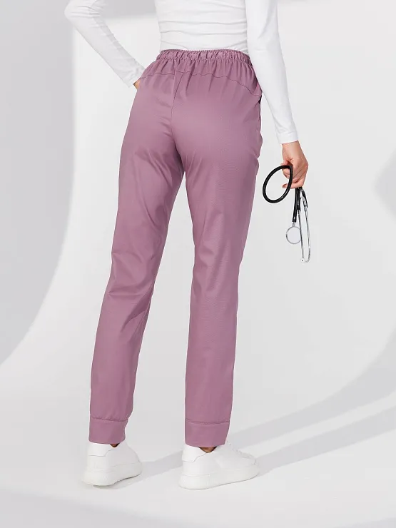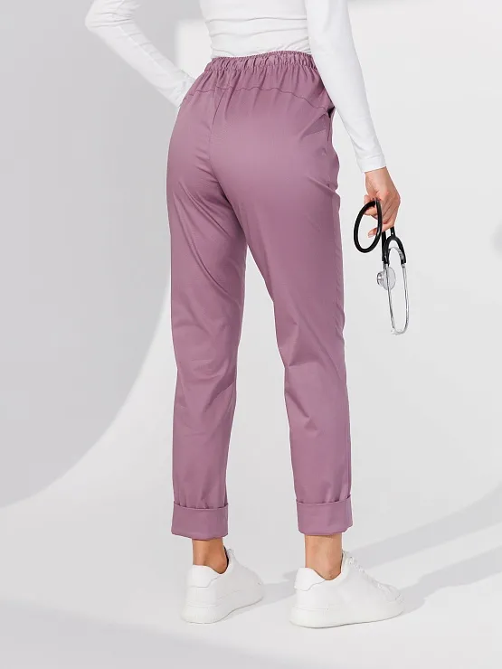 Женские брюки, зауженные книзу. Имеют 2 боковых кармана спереди с держателем. Пояс на резинке, внутренний эластичный шнурок. Низ брюк с притачной манжетой – при желании брюки можно подвернуть. Обратите внимание: брюки представлены в 3-х ростовках (см. таблицу размеров).