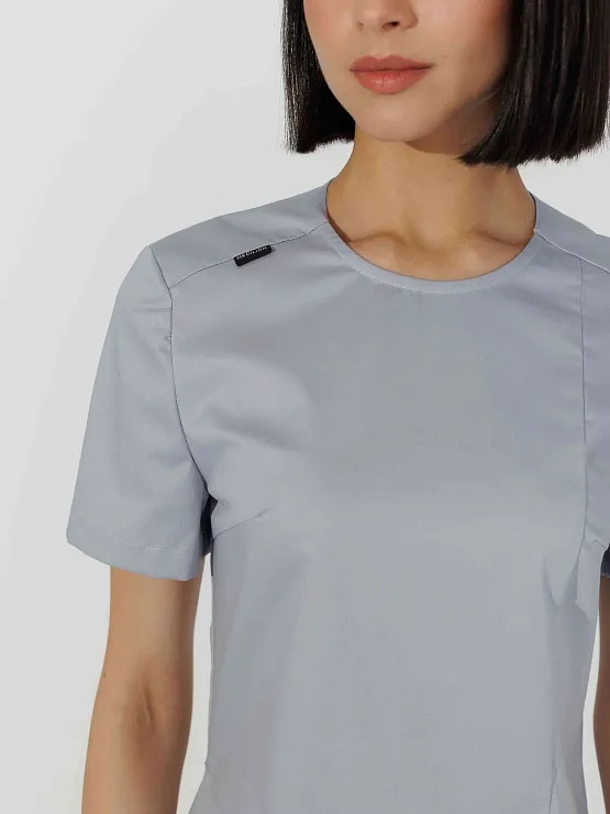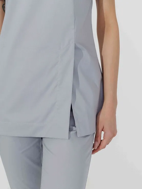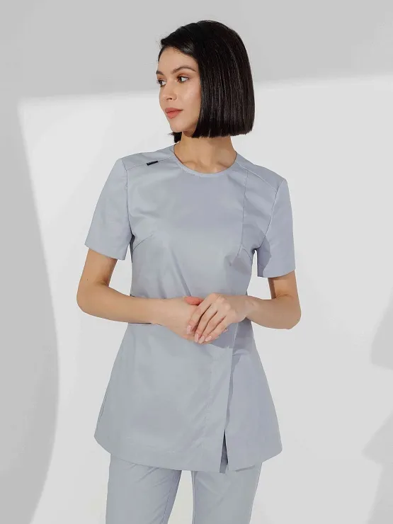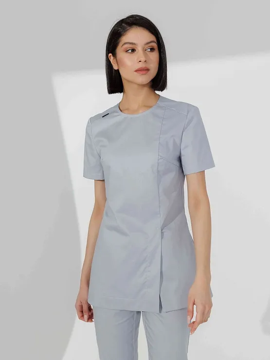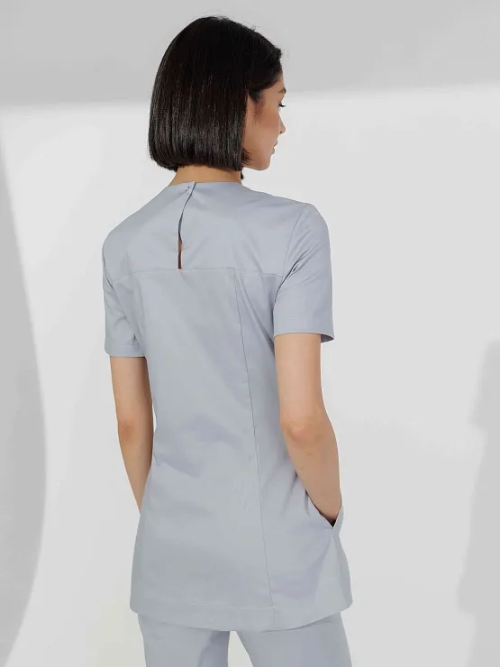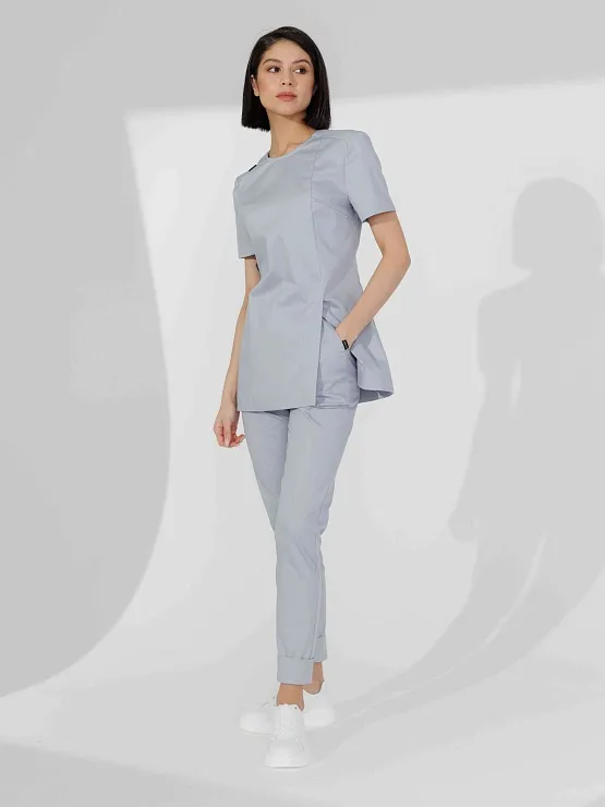 Медицинская туника-трапеция с коротким рукавом. Приталенный силуэт и длина, прикрывающая бёдра, выгодно подчёркивают достоинства фигуры. Шлица спереди изделия обеспечивает свободу движений. Туника имеет вместительный карман в боковом шве.