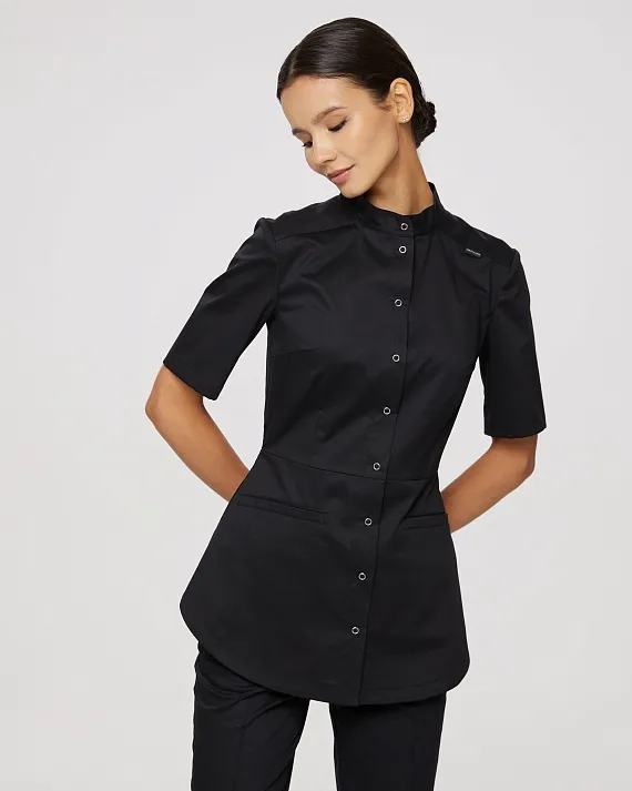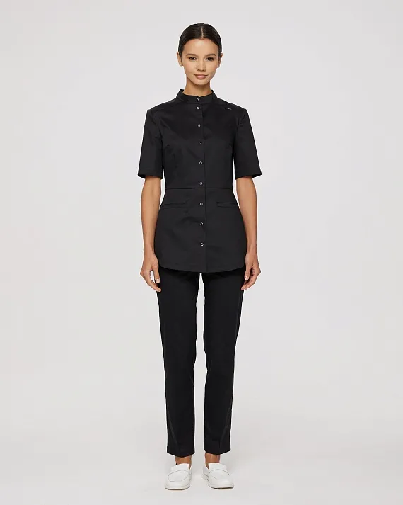 Медицинская рубашка с воротником-стойкой сочетает в себе сдержанность и элегантность. Создаёт идеальный женственный силуэт "песочные часы". Имеет два кармана.