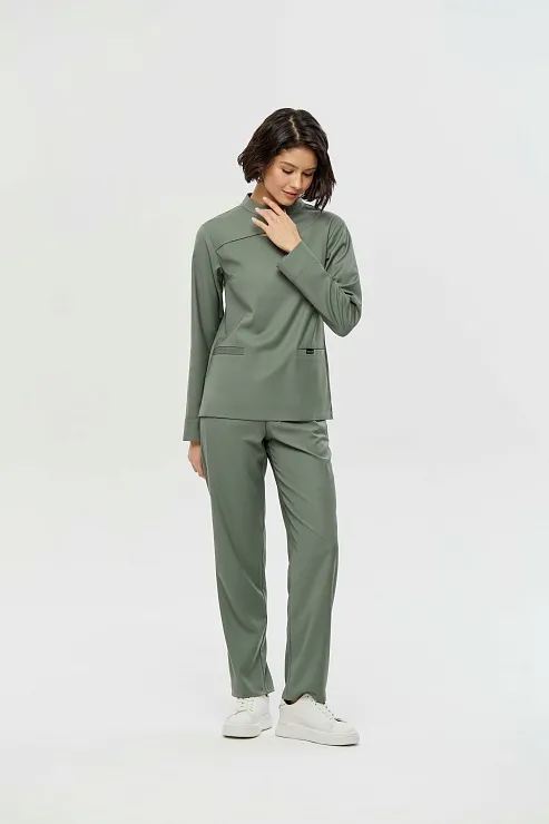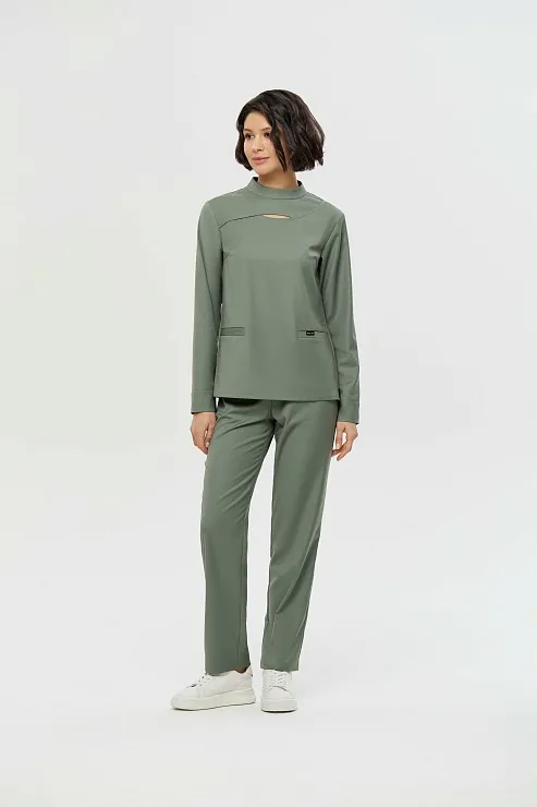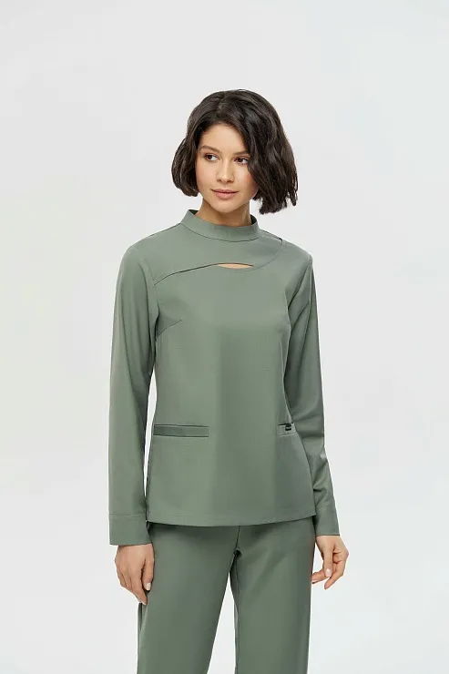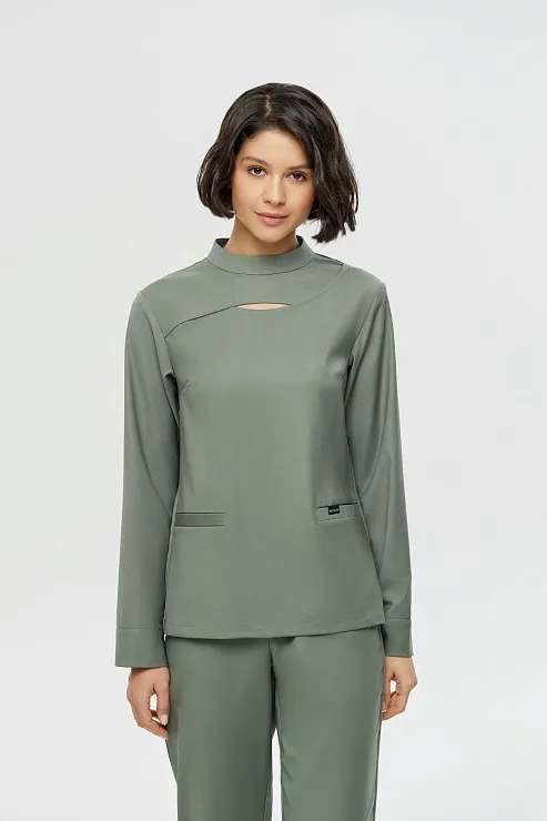Удобный и стильный медицинский лонгслив из мягкой и дышащей поливискозы. Фигурный вырез деликатно подчеркивает женственность, сохраняя деловой стиль. Лонгслив легко комбинируется с любыми брюками из коллекции MEDILION.
